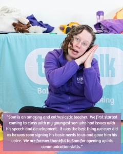 Started attending Tiny Talk to help my 4 year old who has a speech delay. He absolutely loved these classes and his speech has developed so much in just a few months. Signing helps him focus and takes away any frustration if he can't communicate what he needs. Sam is an amazing teacher and we have continued classes with our 16 month old. We have so much fun, we all look forward to the classes each week and the monthly Saturday class.