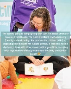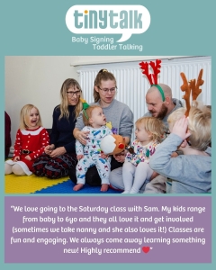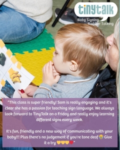 Tiny Talk classes with Sam are a lovely welcoming and educational baby group. I joined classes with Sam with my second baby from 5 months as my eldest really enjoyed Tiny Talk classes. Sam brings great energy to the group and is fantastic with the little ones, a load of memorable songs and themed sessions (eg. Bonfire Night, Christmas etc.) as well as a drink, biscuit and social/play time at the end. The sessions give you a wide range of signs to teach at home with your little ones and we certainly found with our eldest even a few key signs (milk, more, all gone) drastically reduced tantrums as we had a way to communicate effectively before she was able to speak.